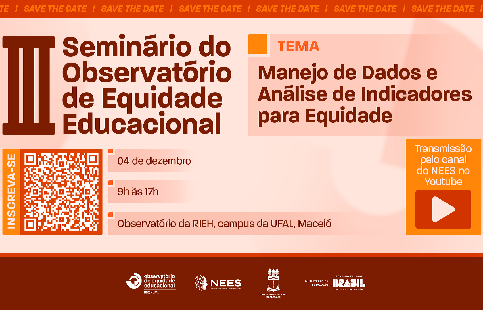 O III Seminário do Observatório da Equidade reforça o compromisso do NEES e da UFAL em promover uma educação mais justa e orientada por dados, contribuindo para o fortalecimento da gestão educacional em Alagoas e no país. Haverá transmissão da programação do seminário, no horário das 9h ao meio-dia, no canal do NEES no Youtube.